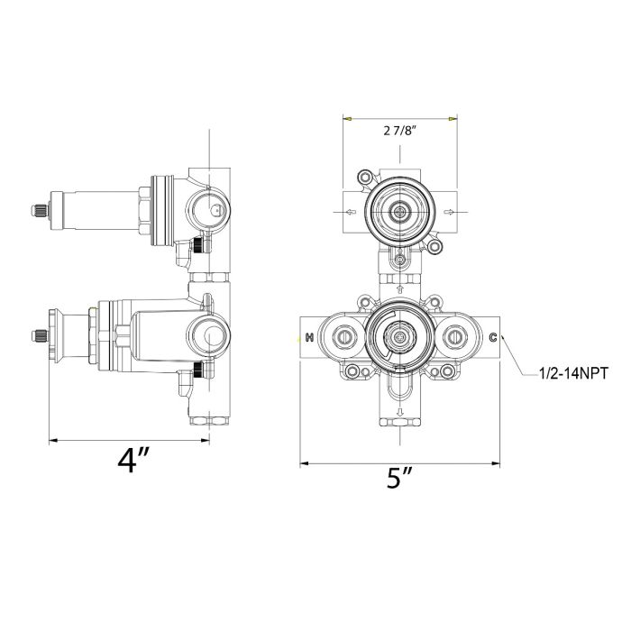 High quality forged brass thermostatic valve with built in dual port outlet transfer valve. The Huntington Brass thermostatic rough-in shower valve will ensure a constant and dependable outlet water temperature for the perfect shower experience. With the Lower handle controlling the water temperature, the upper handle will control the flow to the dual outlet ports.